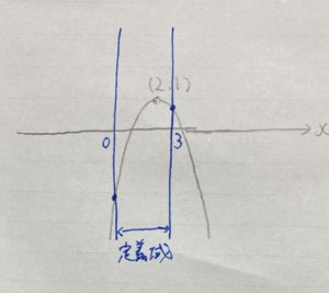 頂点の$x$座標は2です。そして今回の定義域の左端は0、右端は3。
