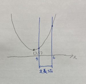 今回の定義域は$4 \leqq x \leqq 6$で、頂点は$(3,5)$。