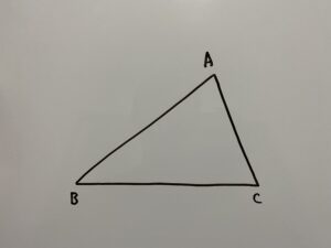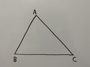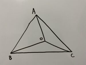 各頂点から対面する辺へ線を引きます。ここで大事なのは、その3本の線は△ABCの中の一点で交わるようにすることです。