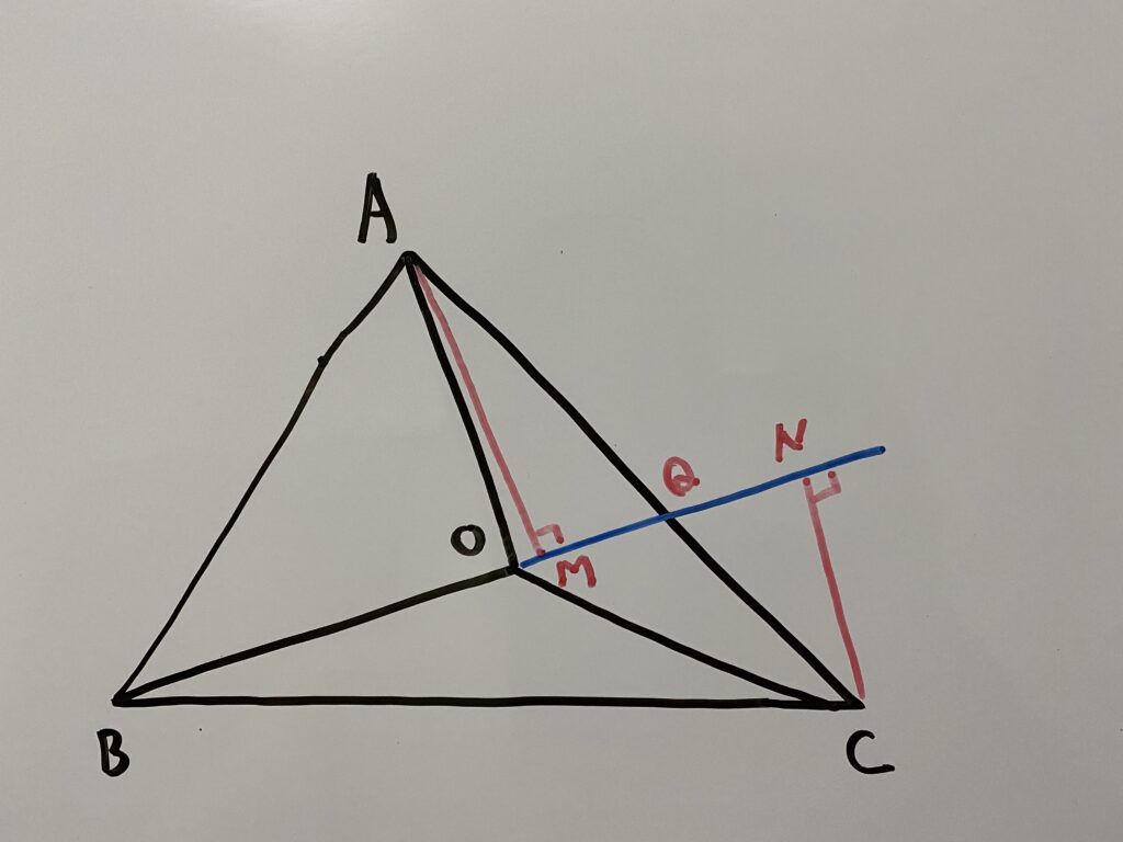 三角形の外で交わる場合でも成立しますが今回は三角形の中の場合をやります。