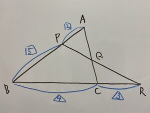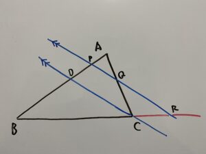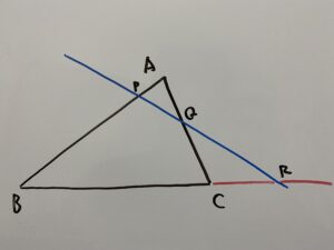 ここに1本の直線を引きます。その直線とABとの交点をP、ACとの交点をQ、その直線と直線BCとの交点をRとします。