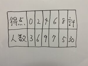 上の表は30人がゲームをした時の得点をまとめた度数分布表です。