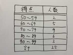 25人の生徒が数学のテストを受け、データ化して度数分布表にしたものです。