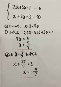 今回みたいな文字が2つ含まれている方程式の場合、連立方程式を習ったのを覚えていますか?