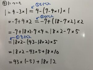 $(①を代入した式):73 \times (-3) +55 \times 4 =1$