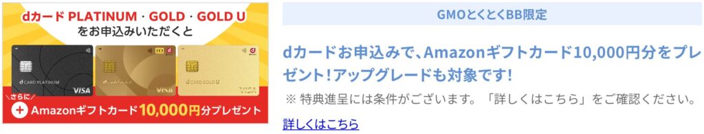 GMOとくとくBBからdカードPLATINUM・GOLD・GOLD Uをお申し込みいただくことでAmazonギフトカード10,000円分がメールにて受け取れる特典になります。