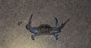 カニx1!…えっ、カニぃ!?!?!?立派なカニが釣れました!引きとしては抵抗する感覚はなく、ゴミでもひっかけたと思いました。調べた感じ「タイワンガザミ」っていう種類かな?