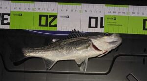 なんとかセイゴが1匹だけ釣れました…ルアーはオルガリップレス43 レインボー・ラメ。アクションはただ巻きです。