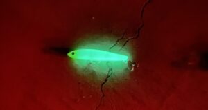 S.P.M65で当たって喰わなかった、またある程度巻いた後のできごとだったため少し小さいS.P.Mでどうだと思いBASSDAY(バスデイ)S.P.M55 チャートヘッドグローで狙ってみます。こちらも最近UV発光するのを知ったので光らせてみますw