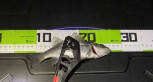 久々に釣れましたセイゴです!プラグはアメミノー48SR-SF マットクリアで1秒に1回転くらいでただ巻きしていたら喰ってくれました。
