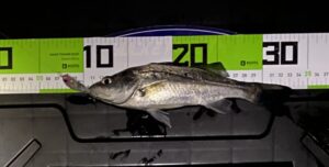 次に堤防側を探ってみます。アメミノーSR-SSのピンクヘッドテールグローにします。