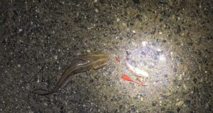 ゴンズイ3匹(左の画像に2匹おります)。ハイいつもの。引きは楽しめますが針外す時だけ注意ね!