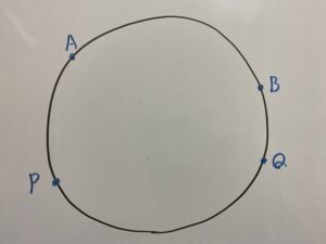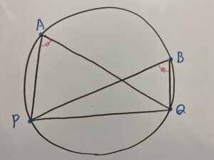 「A,B,P,Qが1つの円上にある」⇨「弧PQに対する円周角$\angle PAQ$、$\angle PBQ$は等しい。」
