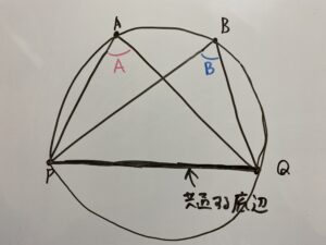 この時底辺に対する2つの角が等しい時、A,B,P,Qは1つの円上にあることになるのです。