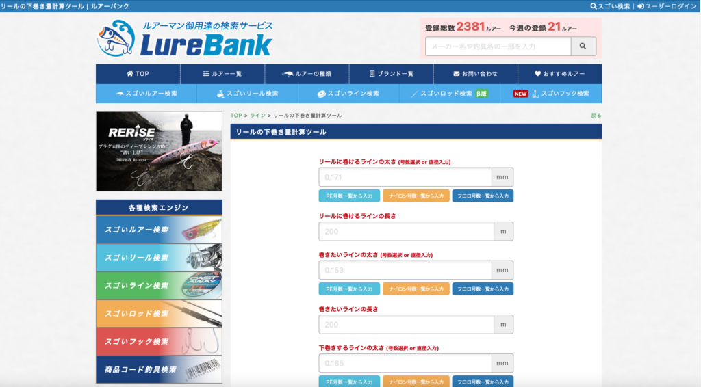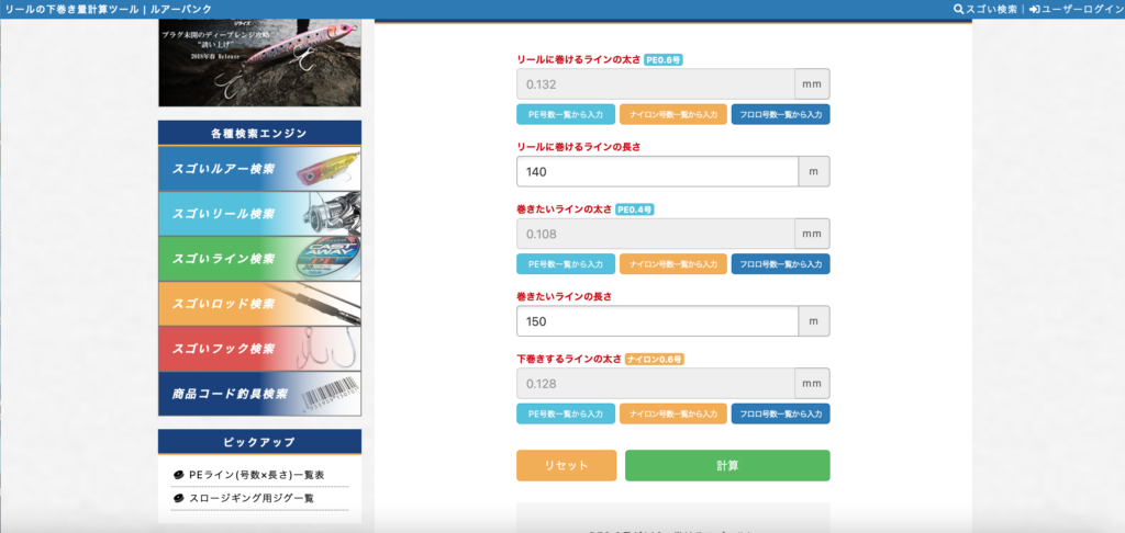 ルアーバンク様の『リールの下巻き計算ツール』を使います。