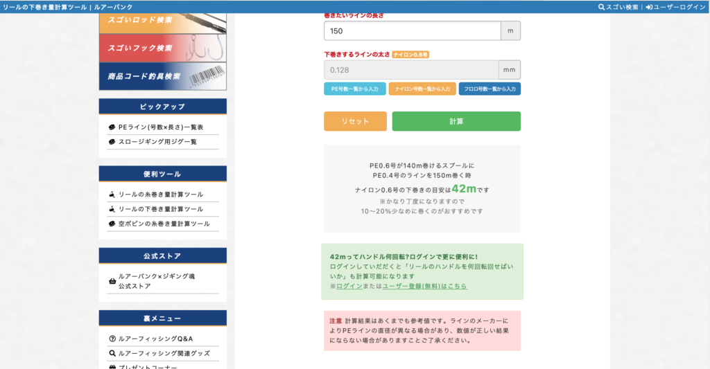 です。これだと0.4号が何メートル巻けるのか分かりませんよね。そんな時便利なのが糸巻き量を調べられるサイトです。