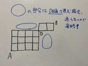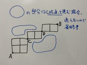 マス目のような図が用意されており、最短距離でゴールに辿り着く場合の数を求める問題です。