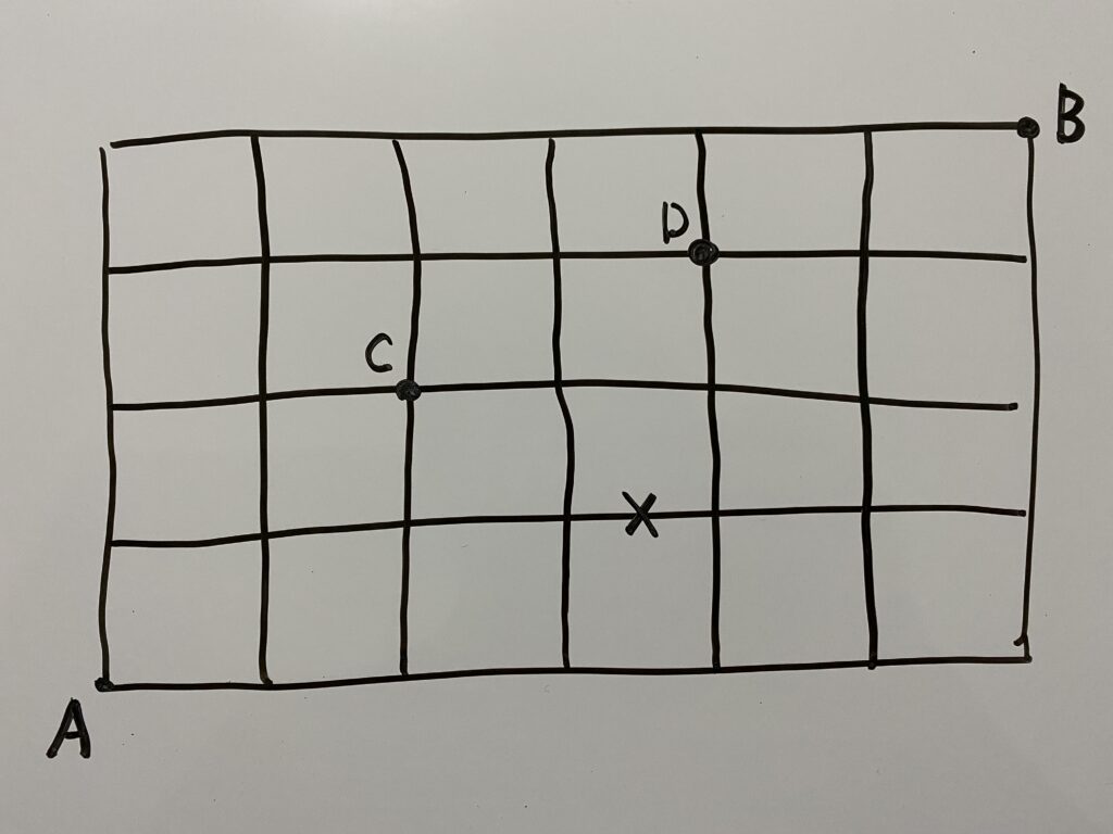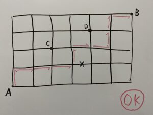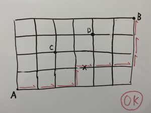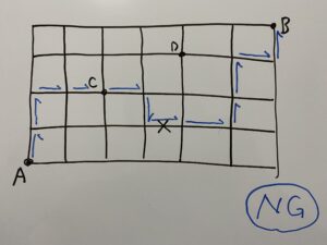今回の問いで最短で向かうためには全ての道で「↑」または「→」の方向に進む必要がありますね?