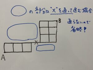 (最短で行く全てのパターン)は(1)で求めたので(”×”を通って最短で行くパターン)を求めましょう。