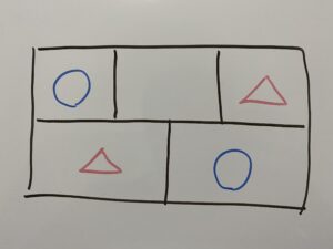 まずは「3色で、かつ隣同士色が重ならない」色分けのパターンを考えてみます。すると