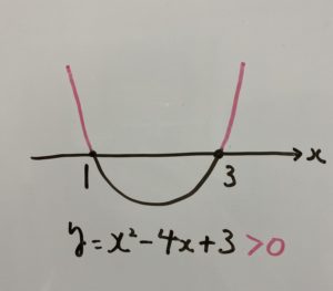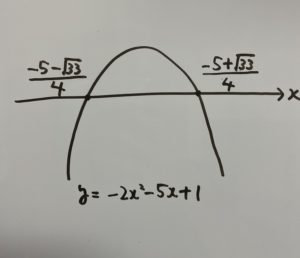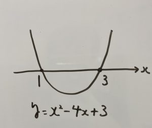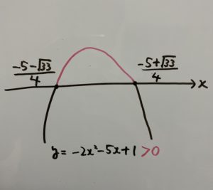 したがって今回の二次不等式は$x$軸と2つの交点を持ちます。