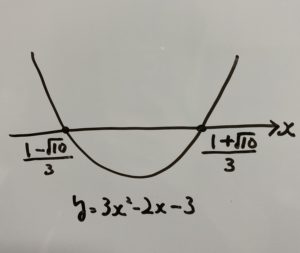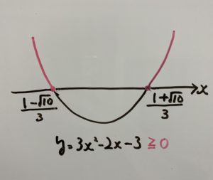 したがって答えは $x \leqq \frac{1-\sqrt{10}}{3},\frac{1+\sqrt{10}}{3} \leqq x$