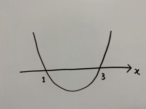 ・$x^2-4x+3=0$を解くと、$(x-3)(x-1)=0$つまり$x=1,3$。