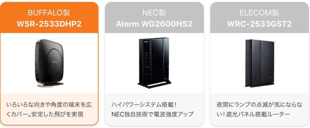 | 機種 | WSR-2533DHP2 | Aterm WG2600HS2 | WRC-2533GST2 |