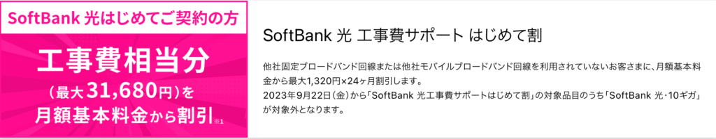 | 工事種別 | SoftBank光工事費 | 特典 |