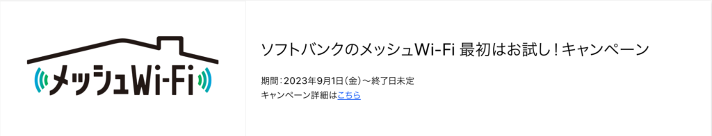 ソフトバンクが提供している「メッシュWi-Fiレンタルサービス」について、お客様が試せるよう、最初の2ヶ月間(880円/月x2)無料になるキャンペーン。