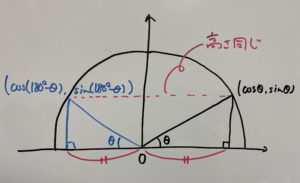 ここで$180°-θ$の場合を考えます。先程赤線で引いた定義を利用すると