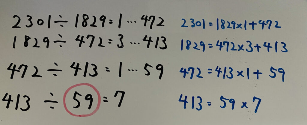 割り切れた時の割った数が最大公約数になります。したがって答えは59。